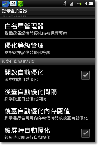 設定上,可以自定選擇該怎麼去優化,也可以隨開機就執行。